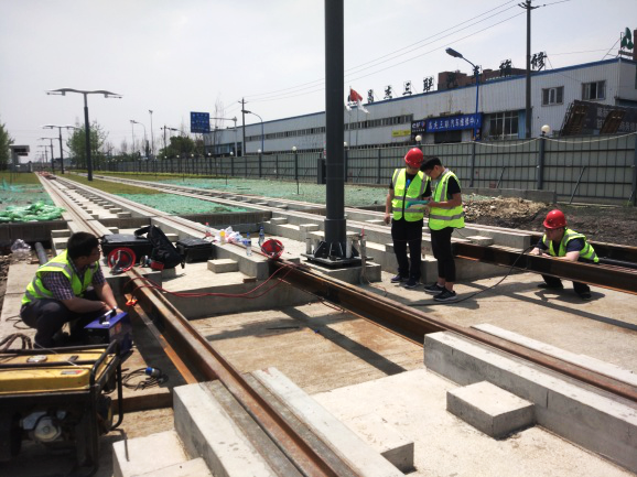 测试结果表明,嵌入式轨道钢轨对地过渡电阻约为规范标准值10~15倍(规范规定新建线路对地过渡电阻≥15Ω·km),与预期结果一致。在嵌入式轨道中,钢轨被高绝缘性高分子材料包裹,提升了钢轨对地绝缘性能,可有效防止杂散电流的产生。在通过燃气管线、输油管道等具有杂散电流防治要求的路段时,具有良好的应用优势。