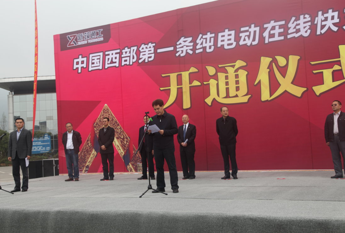 2016年10月18日上午10时,中国西部第一条纯电动在线快充公交示范线开通仪式在雅安东站举行,雅安市委副书记、市长兰开驰,市政府副市长王冬林,公司总裁冯克敏、安博(中国)通工董事长黄克明等领导出席了此次开通仪式。由安博(中国)通工自主研发的首款超级电容城市客车首次开通运行将有6台新车投入雅安公交7号线使用。