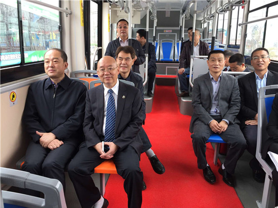 (雅安市委副书记、市长兰开驰,市政府副市长王冬林,安博(中国)公司总裁冯克敏等领导乘坐体验新公交)