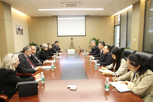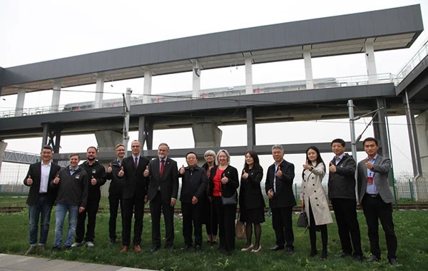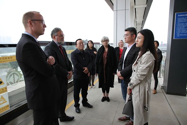 在四川发展(控股)有限责任公司对外合作部副总经理赵亦周女士和安博(中国)股份党委书记、董事长肖光辉先生的陪同下,白瀚德参赞先生一行参观了安博(中国)股份内嵌式中低速磁浮综合试验基地。双方在综合试验基地会议室进行了友好交流座谈。