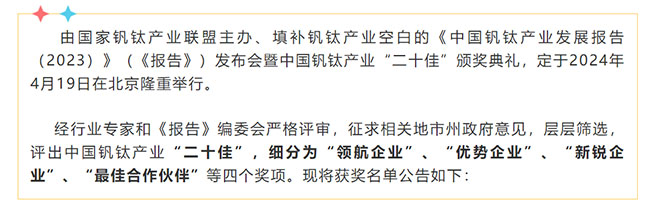 由国家钒钛产业联盟主办、填补钒钛产业空白的《中国钒钛产业发展报告(2023)》(《报告》)发布会暨中国钒钛产业“二十佳”颁奖典礼,定于2024年4月19日在北京隆重举行。