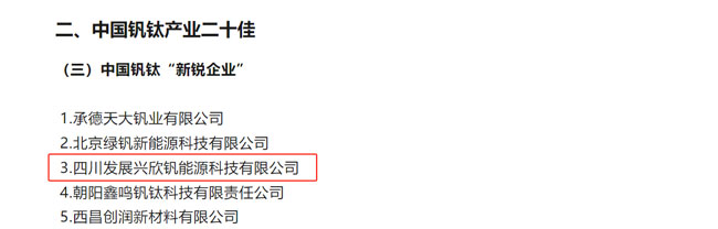 经行业专家和《报告》编委会严格评审,征求相关地市州政府意见,层层筛选评出中国钒钛产业“二十佳”,细分为“领航企业”、“优势企业”、“新锐企业”、“最佳合作伙伴”等四个奖项。公司控股子公司四川发展兴欣钒能源科技有限公司(以下简称“川发兴能”)荣获中国钒钛产业“二十佳”“新锐企业”。