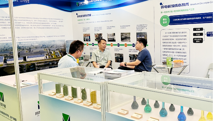 在为期三天展会期间,川发兴能的市场团队向外界详细介绍了公司基本情况、产品、科研技术、项目建设和未来发展规划等,引发行业积极反响,其中公司年产6万立方米短流程钒电解液生产线工程项目最引人关注。川发兴能正在建设中的“年产6万立方米短流程钒电解液制备项目”是目前全球产能规模最大的短流程钒电解液制备项目,预计将于2024年10月建成投产。该项目采用的新一代短流程钒电解液生产技术,工艺流程短能够大幅提高钒系统回收率,并显著降低生产过程中的辅材消耗等。川发兴能新一代短流程钒电解液制备技术研发成功及大规模产业化,对推动我国钒电池储能产业化和商业化具有深远的意义。